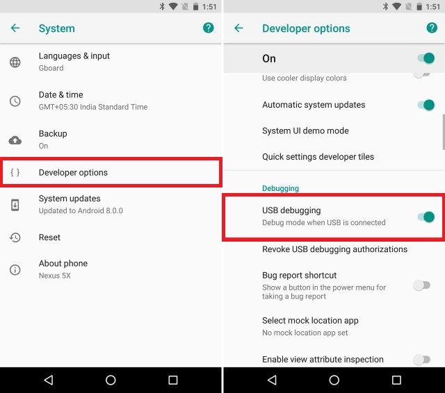 - Pour commencer, passez à Paramètres -> Système -> Options du développeur et activez le basculement à côté de « Débogage USB » .