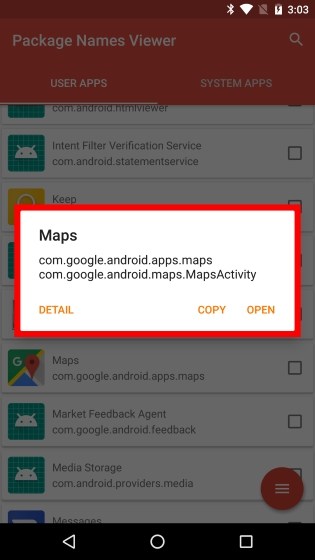 - Maintenant, ouvrez Package Names Viewer. L’application vous montrera la liste des différentes applications installées sur votre appareil, ainsi que leurs noms de paquetages et d’activités. Notez le nom du package et le nom de l’activité de l’application que vous souhaitez configurer comme raccourci sur votre écran de verrouillage. Pour cette démonstration, j’utiliserais l’application Google Maps, qui comprend: