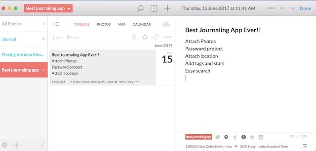 Day One est l’une de ces quelques applications qui rend l’expérience de l’utilisation de l’application plus puissante que le but qu’elle sert. L’application semble magnifique. De son design à son UI et son système de couleurs à sa typographie, tout induit un sentiment de calme. L’ensemble de fonctionnalités est également énorme. Vous pouvez créer plusieurs journaux et chaque journal peut contenir des pages infinies. Non seulement vous pouvez écrire à l’intérieur de l’application, vous pouvez même attacher des photos pour soutenir vos souvenirs avec des indices visuels. Ma fonction préférée est l’ajout de données de géolocalisation. Cela vous aide à voir les endroits où vous avez enregistré votre journal.