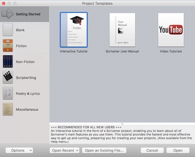 Lorsque vous lancez l’application, vous devrez créer un projet. Il existe quelques modèles qui peuvent vous aider à démarrer. Un projet est l’endroit où tout se déroulera. Pour cet article, j’ai choisi le nouveau modèle. Maintenant, je ne peux pas approfondir toutes les fonctionnalités de Scrivener, mais je vais couvrir certaines fonctionnalités intéressantes qui le rendent le mieux adapté à l’écriture longue.