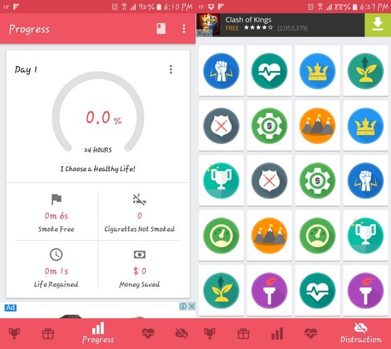 Smoke Free est une application qui offre des fonctionnalités que la première application ne fonctionne pas. Avec Smoke Free, vous pouvez conserver un journal de vos progrès, noter tout sur les envies que vous avez, effectuer des tâches quotidiennes pour améliorer vos chances de cessation d’emploi et gagner des badges pour ne pas fumer.