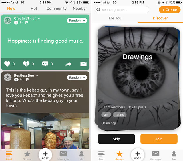 L’application prend également en charge les groupes, que vous pouvez rejoindre selon vos intérêts, et partagez vos pensées de manière anonyme. Si vous ne voyez pas le type de groupe que vous aimez, il est toujours possible de créer un groupe vous-même, puis de faire en sorte que les gens s’y joignent. Candid prend en charge la messagerie ainsi, afin que vous puissiez discuter avec des personnes qui vous intéressent, ou des personnes qui partagent les mêmes pensées que vous. L’application demande le numéro de téléphone et l’accès à Facebook, mais vous pouvez facilement ignorer cela, et vous devriez, si vous souhaitez rester anonyme.