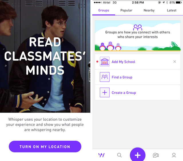 Whisper a été autour de Yik Yak pendant un bon moment maintenant, et alors qu’il est assez similaire à Yik Yak, sa base d’utilisateurs est composé de personnes de nombreux groupes d’âge différents. Whisper possède des fonctionnalités telles que la création de messages anonymes et les commentaires sur d’autres personnes. L’application se divise Whispers (c’est ce que les messages Whisper sont appelés) dans différentes catégories par popularité, emplacement, etc. Il y a aussi un onglet de recherche, vous pouvez rechercher des chuchotements contenant des expressions spécifiques, et se connecter avec des personnes partageant les mêmes idées.