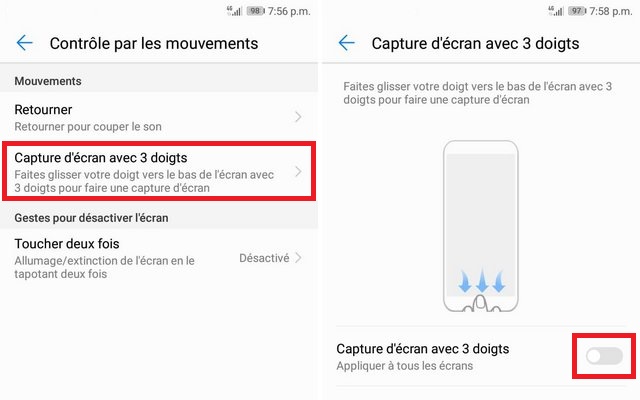 • Dans le menu, tapez sur Capture d’écran avec 3 doigts et activez le bouton du curseur.