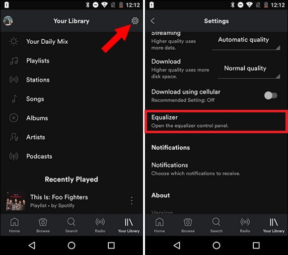 Sur Android, ouvrez Spotify et appuyez sur l’icône en forme de roue dentée dans le coin supérieur droit. Faites défiler vers le bas, puis sélectionnez Égaliseur.