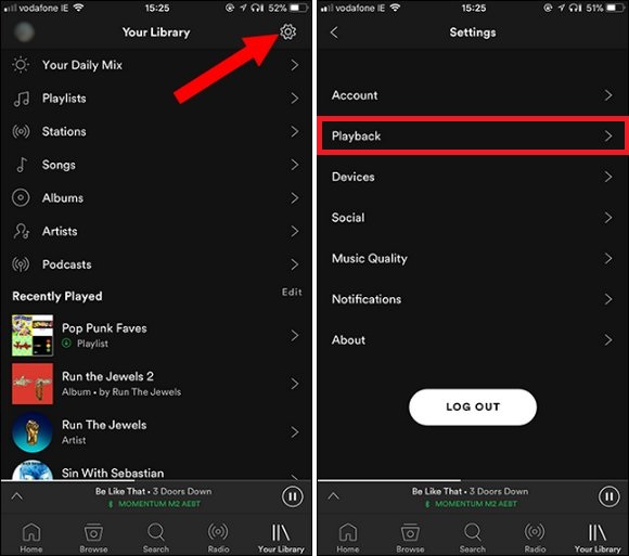 Si vous êtes sur un iPhone, ouvrez Spotify et accédez à l’onglet Votre bibliothèque. Appuyez sur l’icône représentant une roue dentée dans l’angle supérieur droit, puis sélectionnez Lecture.