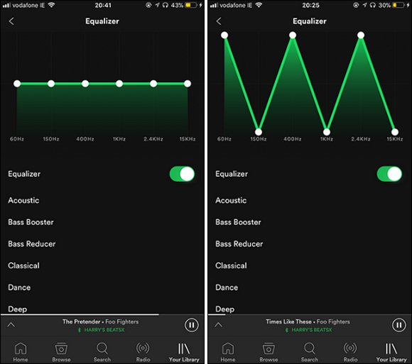 Il appartient à chaque fabricant Android d’installer son propre égaliseur, que Spotify utilise ensuite. Ci-dessous vous pouvez voir les égaliseurs des versions Motorola et Samsung Android.
