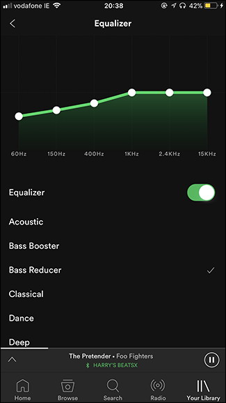 Si vous ne voulez pas vous tromper dans vos propres réglages d’égaliseur, ou si vous voulez simplement garder les choses simples, vous pouvez également sélectionner l’un des préréglages de Spotify. Ceux-ci sont nommés soit après leur fonction (par exemple Bass Booster ou Bass Reducer) ou le type de musique pour lequel ils fonctionnent le mieux (par exemple Rock ou Classique). Appuyez simplement sur un préréglage pour l’appliquer.