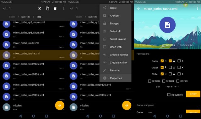 - Assurez-vous maintenant que le mixer_paths_tasha.xml nouvellement modifié possède les autorisations correctes. Pour définir les autorisations, appuyez longuement sur le fichier pour le sélectionner et accéder à ses propriétés. La méthode à suivre dépend de l’explorateur de fichiers que vous utilisez. Sur ES File Explorer et Solid Explorer, vous pouvez le faire en appuyant sur le bouton de menu à trois points en haut à droite. Reportez-vous à la capture d’écran ci-dessous pour définir les autorisations correctes.