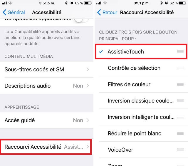 - Pour activer Triple-cliquez sur Accueil, tapez sur Réglages > Général > Accessibilité.