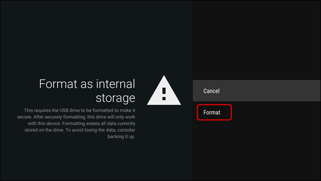 Un avertissement s’affiche pour vous informer que le contenu actuel du lecteur sera effacé afin qu’il puisse être redéfini en tant que stockage interne. Si vous êtes cool avec ça, allez-y et cliquez sur le bouton « Format ».
