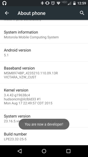 Devenir un développeur est une option cachée. Vous ne trouverez pas « Déverrouiller les options de développeur » dans votre menu Paramètres. Ce que vous devez faire, c’est aller à Paramètres > À propos de périphérique et faire défiler vers le bas vers le numéro de génération. Tapez le nombre de chiffres à plusieurs reprises. Vous ne recevrez aucune réponse, mais si vous appuyez plusieurs fois, vous recevrez une notification vous félicitant pour votre promotion au développeur.