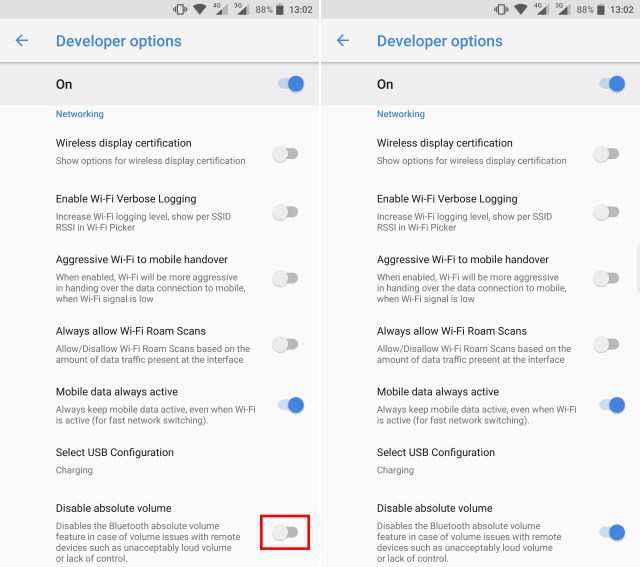 Une fois dans les options du développeur, faites défiler jusqu’à la section Réseau. Ici, activez la bascule à côté de Désactiver le volume absolu.
