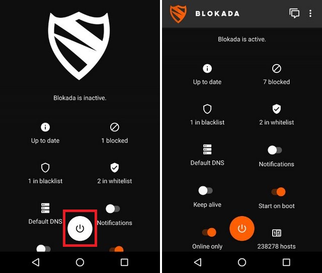 1. Il n’y a pas beaucoup de configuration impliquée pour faire fonctionner Blokada. Une fois l’application installée, lancez-la et appuyez sur le bouton d’ alimentation situé en bas de l’écran.