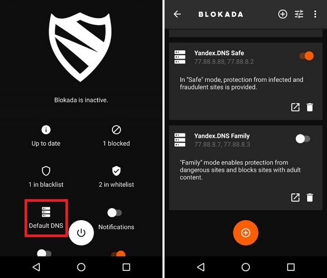 5. Alors que Blokada peut être utilisé sans passer du temps sur la configuration, vous pouvez toujours l’ajuster à vos besoins. Sur la page d’accueil, appuyez sur « DNS par défaut » pour afficher la liste des serveurs DNS que Blokada bloquera pour vous. Vous pouvez activer celui que vous voulez ou entrer une adresse de serveur DNS personnalisée si vous préférez.