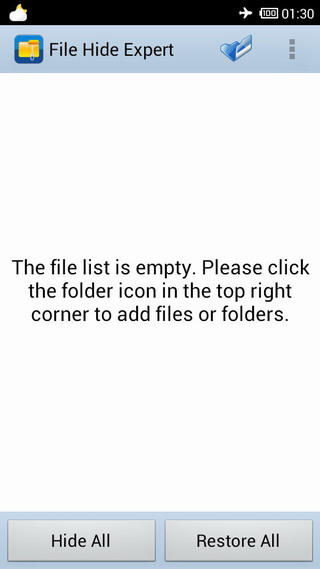 Une application solide pour cette tâche est File Hide Expert. C’est une application gratuite, et cela vous permet de cacher et de démonter facilement n’importe quel fichier sur votre téléphone. Pour démarrer, téléchargez d’abord l’application depuis Google Play Store. Lorsque vous ouvrez l’application, vous recevrez un message indiquant que la liste des fichiers cachés est vide. Appuyez sur l’icône du dossier en haut à droite de l’écran pour commencer à cacher les fichiers.