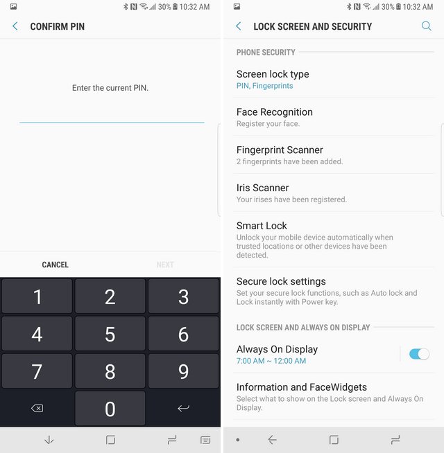 - Reconnaissance de visage: Le téléphone examinera vos traits faciaux uniques et utilisera la caméra frontale pour reconnaître votre identité. Samsung avertit que la méthode pourrait être bernée avec une image assez bonne ou un utilisateur très similaire.