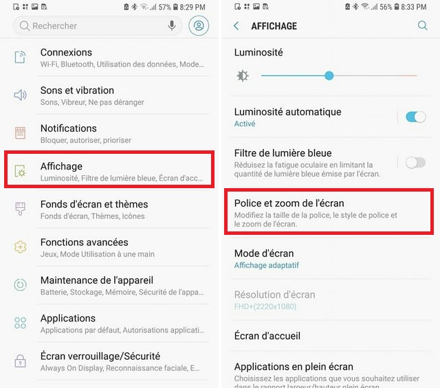 Appuyez sur l’option Affichage, puis appuyez sur le Police et zoom de l’écran.