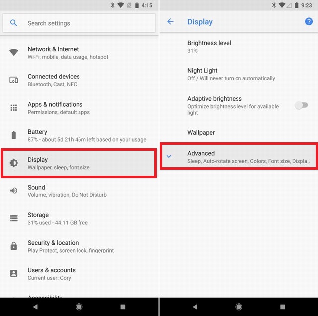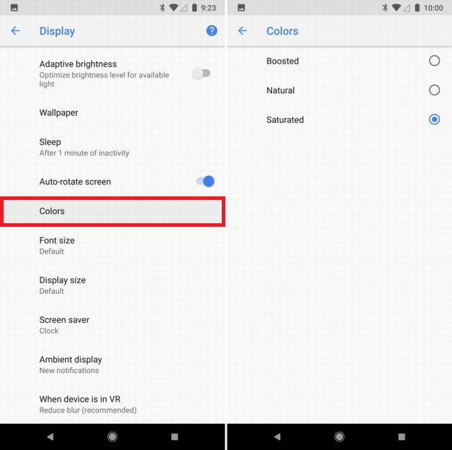 Ces trois options changeront radicalement l’apparence générale du Pixel 2 XL et la manière dont les couleurs seront affichées. Par défaut, il est défini sur Naturel, ce qui correspond aux couleurs précises mais ennuyeuses dont se plaignent de nombreux propriétaires.