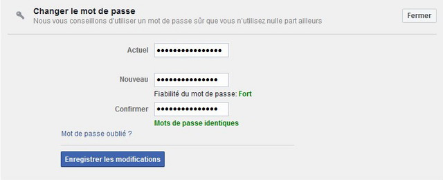 Entrez votre mot de passe actuel et votre nouveau mot de passe deux fois. Si elle est trop courte, trop faible ou si la confirmation ne correspond pas, Facebook vous en informera.