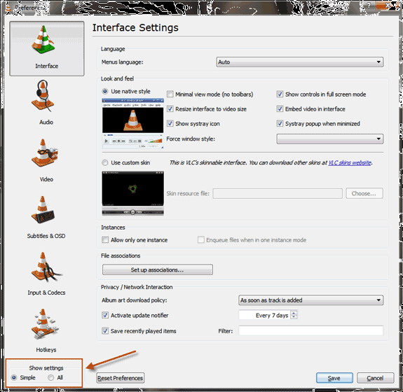 Ouvrez VLC et cliquez sur Outils> Préférences. Ensuite, sélectionnez Tous les sous paramètres Afficher.