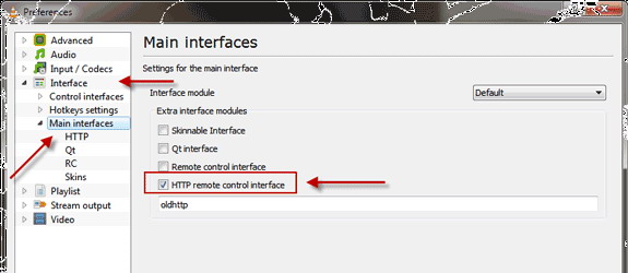 Cela lance les paramètres avancés de VLC. Sélectionnez ensuite, Interface> interfaces principales. Dans les interfaces principales fenêtre, sélectionnez «HTTP à distance interface de commande.»