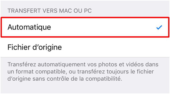 Apple offre deux modes du transfert : Automatique et Fichier d’origine. Le premier permet de transférer automatiquement les photos dans un format compatible. Allez aux Réglages > Choisissez Photos > Défilez vers le bas et choisissez Automatique.