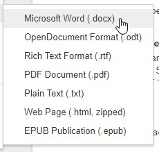 Vous verrez apparaître une liste d’options dans ce menu. Comme vous pouvez le voir, la conversion en documents Word n’est pas la seule chose que Google Docs peut faire! Si vous avez déjà besoin de télécharger un document Google en format PDF, ou même de convertir un dans le format ebook EPUB, vous pouvez revenir à ce menu et le faire. Pour l’instant, cependant, nous allons cliquer sur l’option « Microsoft Word ».