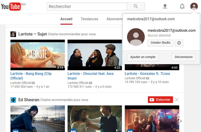 - Maintenant, vous serez transféré sur YouTube avec votre adresse courriel qui n’est pas celle de Gmail.