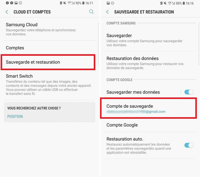 - Ici basculez sur l’option Sauvegarder mes données, puis sélectionnez le compte Google dans l’option Compte de sauvegarde.
