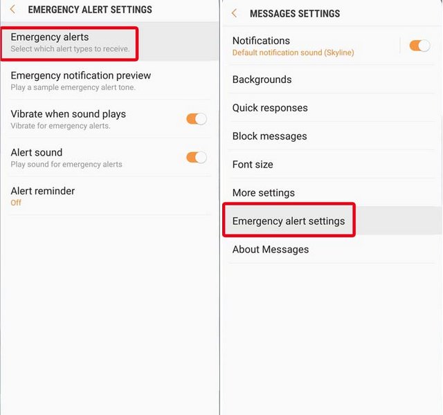 4. Pour activer ou désactiver des types d’alertes spécifiques, appuyez sur Alertes d’urgence. Il y a quatre types de liste: Présidentielle, Extrême, Sévère et Ambre. Vous ne pouvez pas désactiver les alertes présidentielles, mais vous pouvez désactiver le reste.