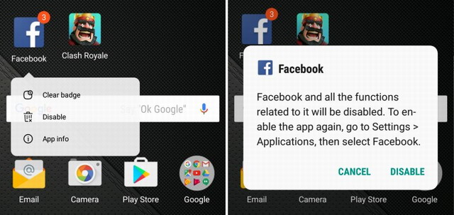 Pour ceux qui ne le savaient pas, Nougat a apporté quelques fonctionnalités intéressantes. Il y en a trop à énumérer, alors nous allons nous concentrer sur quelques-uns seulement. Appui long (ou appuyez et maintenez) l’une des icônes sur votre écran d’accueil Galaxy S7. Vous verrez une fenêtre contextuelle contenant des options. Les propriétaires peuvent désactiver dans les applications vidant la batterie, effacer les notifications de badge, ou même les désactiver complètement. Comme le compteur de notification sur Facebook, ou désactiver une application en difficulté.