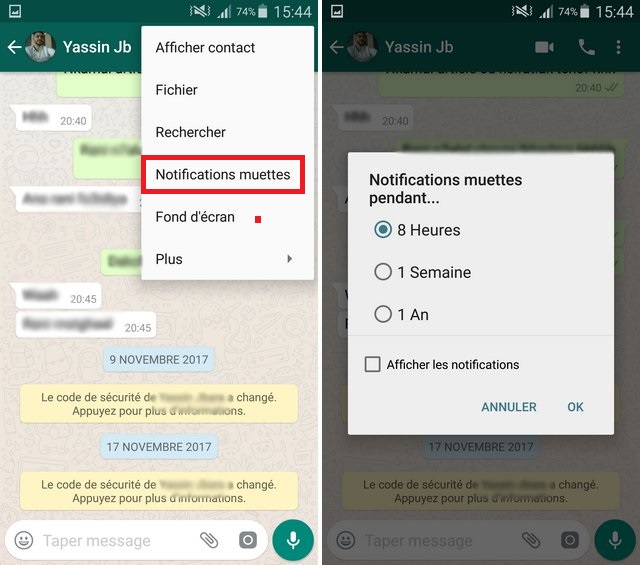 Pour désactiver les notifications pour un contact ou un groupe particulier, ouvrez simplement ce contact / groupe et appuyez sur les trois points verticaux. Sélectionnez « Mute notifications » et choisissez combien de temps vous souhaitez les couper. Vous pouvez choisir entre huit heures, une semaine ou une année.