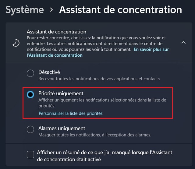 - Si vous souhaitez voir uniquement les notifications d’applications sélectionnées, sélectionnez l’option Priorité uniquement et cliquez sur le lien « Personnaliser la liste des priorités ».
