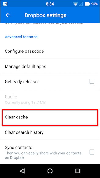 Comme le temps passe, ce cache peut pousser plus en plus grande. Si votre téléphone ou tablette se plaint qu’il n’a tout simplement pas plus d’espace, de vider le cache de Dropbox peut vous donner rapidement une marge de manoeuvre … pourvu que vous avez ouvert quelques gros fichiers Dropbox récemment.