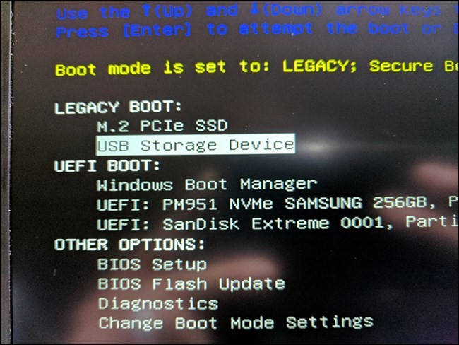 tout fourni est correctement configuré, vous devriez être en mesure de démarrer simplement votre PC et appuyer sur une touche comme F10 ou F12 pour entrer dans un menu de démarrage (cela peut varier d’un ordinateur à l’autre). De là, sélectionnez votre clé USB.