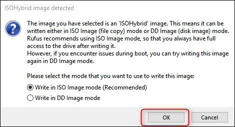Une boîte de dialogue devrait apparaître ici vous permettant de savoir que le fichier est une image isohybrid, ce qui en fait peut être écrit de deux façons: comme une image DD ISO ou. La valeur par défaut et la méthode recommandée-ISO Image-doivent être pré-sélectionnés. Allez-y et cliquez sur OK pour confirmer.