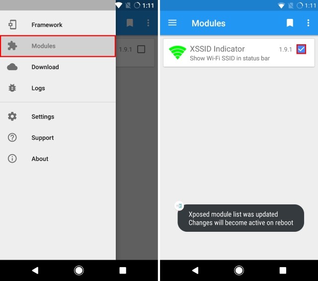 - Une fois que votre appareil a redémarré, les modifications du module auront lieu. Par exemple, j’ai installé l’indicateur XSSID qui montre essentiellement que le SSID de WiFi dans la barre d’état. Comme vous pouvez le voir ci-dessous, cela fonctionne bien.