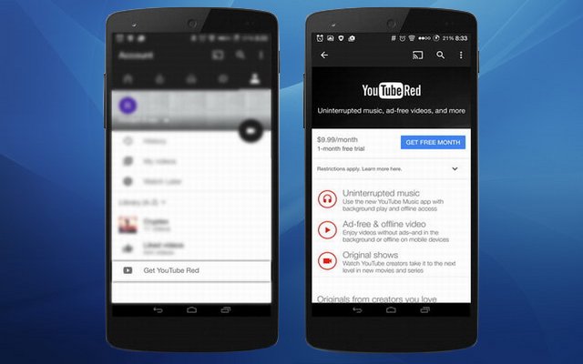 Obtenons YouTube Red d’abord. YouTube Red est un service basé sur un abonnement qui vous permet de lire du contenu en arrière-plan, de regarder des émissions originales exclusives aux abonnés de YouTube Red et d’éviter les publicités. Ce service est disponible aux États-Unis, et vous pouvez l’abonner directement depuis l’application YouTube.