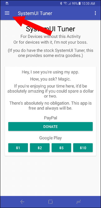 Une fois que vous avez configuré, tout le reste est une navigation fluide. Allumez l’application System UI Tuner, puis ouvrez le menu en haut à gauche pour commencer.