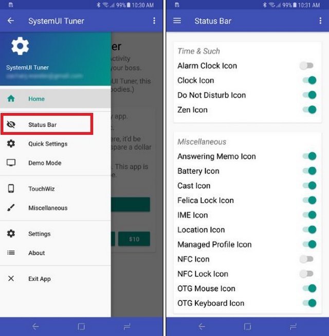 Dans le menu, choisissez l’option « Barre d’état ». Tout comme sur stock Android, vous pouvez exécuter et activer ou désactiver ce que vous voulez. Ces changements devraient se produire en temps réel, donc, si vous n’êtes pas dans la façon dont quelque chose ressemble, vous pouvez facilement le modifier.
