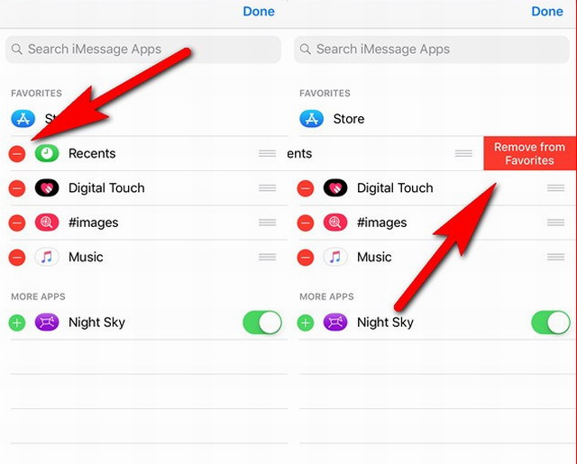 Comme vous pouvez le voir, il y a beaucoup d’applications sous l’onglet « Favoris » par défaut, et toutes ces icônes d’application apparaissent sur votre écran iMessage. Appuyez simplement sur le bouton rouge à gauche de chaque application que vous souhaitez supprimer de la liste, puis appuyez sur Supprimer des favoris.