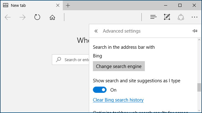 - Afficher les suggestions de recherche comme type I : Edge envoyer tout ce que vous tapez dans la barre d’adresse de votre moteur de recherche-Bing par défaut, mais vous pouvez le modifier à Google ou un autre moteur de recherche d’ici et vous montrer des suggestions que vous tapez. Si vous désactivez cette option, Bord seulement envoyer des recherches sur votre moteur de recherche lorsque vous appuyez sur Entrée.