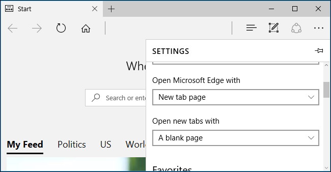de «Start Page» Edge affiche toujours le flux de nouvelles lorsque vous ouvrez une nouvelle fenêtre Edge. Pour masquer l’alimentation lorsque vous lancez Edge, cliquez sur le «Ouvrez Microsoft Edge» et sélectionnez «Nouvelle page d’onglet». Vous pouvez également sélectionner «pages précédentes» pour rouvrir quelles que soient pages ouvertes avant la fermeture Edge, ou «Une page spécifique ou pages» pour avoir bord ouvert une ou plusieurs pages Web spécifiques.