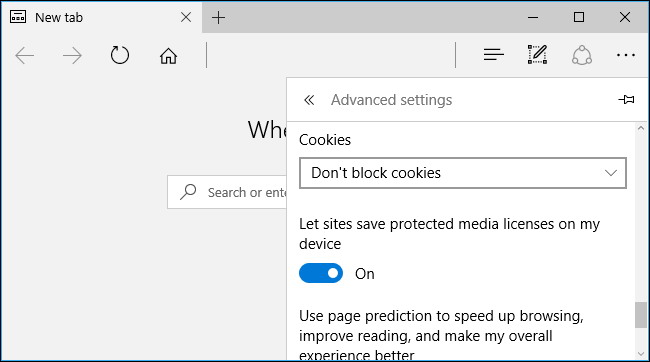 - Cookies : Par défaut, Edge accepte tous les cookies provenant de sites Web. Les sites Web utilisent ces pour enregistrer votre statut de connexion et d’autres préférences. Vous pouvez choisir de «Bloquer tous les cookies», mais vous ne serez pas en mesure de se connecter à des sites Web et le Web sera plus ennuyeux. Vous pouvez également sélectionner «Bloquer uniquement les cookies tiers» pour bloquer les cookies à moins qu’ils soient du site précis que vous visitez. Les cookies tiers sont souvent utilisés par les réseaux de suivi de la publicité, par exemple, bien qu’ils puissent être utilisés à d’autres fins.