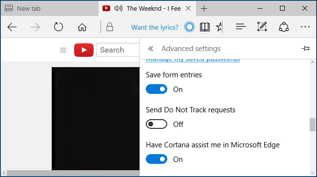 - Avez Cortana me aider à Microsoft Edge : Cortana est activé Edge par défaut et tuyaux avec des informations relatives à ce que vous visitez. Par exemple, lorsque vous regardez une vidéo de musique, Cortana vous demandera si vous voulez que les paroles. Microsoft documentation indique votre historique de navigation sur le Web est envoyé à Microsoft si vous utilisez Cortana Edge. Vous pouvez désactiver l’intégration Cortana pour empêcher que cela se produise.