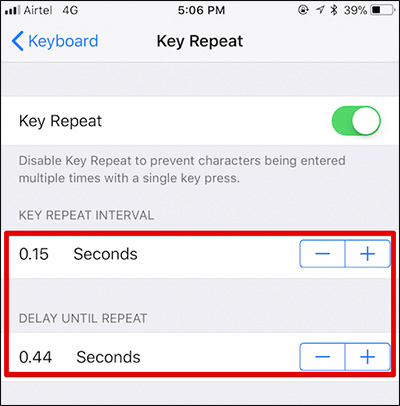 Il existe également une option pour augmenter / diminuer l’intervalle de répétition des touches. Utilisez le bouton « – » pour diminuer l’intervalle de répétition de la touche, appuyez sur le bouton « + » pour l’augmenter.