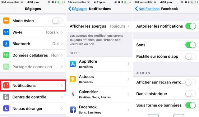 Vous pouvez désactiver complètement les notifications, désactiver le son, supprimer la petite bulle rouge sur les icônes d’application, conserver une bannière jusqu’à ce que vous la supprimiez, choisir si les notifications s’affichent dans l’historique ou sur l’écran de verrouillage.