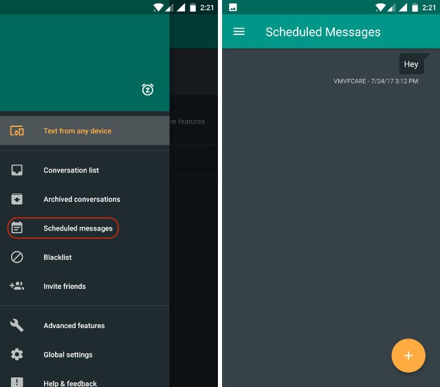 Cependant, une chose que je n’aime pas de cette application est la manière dont elle stocke vos messages programmés. Les messages programmés ne sont pas stockés dans la conversation d’origine plutôt qu’ils sont stockés dans leur propre dossier. Bien que je n’aime pas cette approche, beaucoup de gens pourraient l’aimer car cela vous permet également de voir tous vos messages programmés dans un endroit. Pour trouver tous vos messages programmés, ouvrez le menu de l’hamburger, puis appuyez sur « Messages programmés » . Ici, vous pouvez afficher tous vos messages programmés.