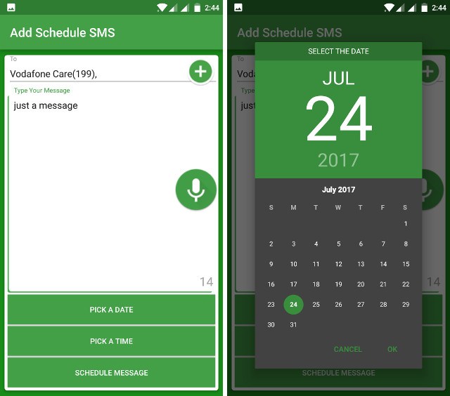 Si vous aimez votre application de messagerie Android et ne souhaitez pas passer à une autre application, vous pouvez utiliser cette application en tant que complément, car cela n’est utilisé que pour l’envoi de messages texte programmés. Pour planifier un message texte, lancez l’application, puis appuyez sur le bouton plus pour commencer à composer le message. Ici, vous pouvez planifier un message en lui attribuant la date et l’heure. L’application est très légère et rapide. Cependant, l’interface utilisateur se sent un peu vieillotte. L’application est gratuite pour les publicités. Mais, il est bon que vous ne voyiez les annonces qu’une fois que vous avez appuyé sur le bouton d’envoi.